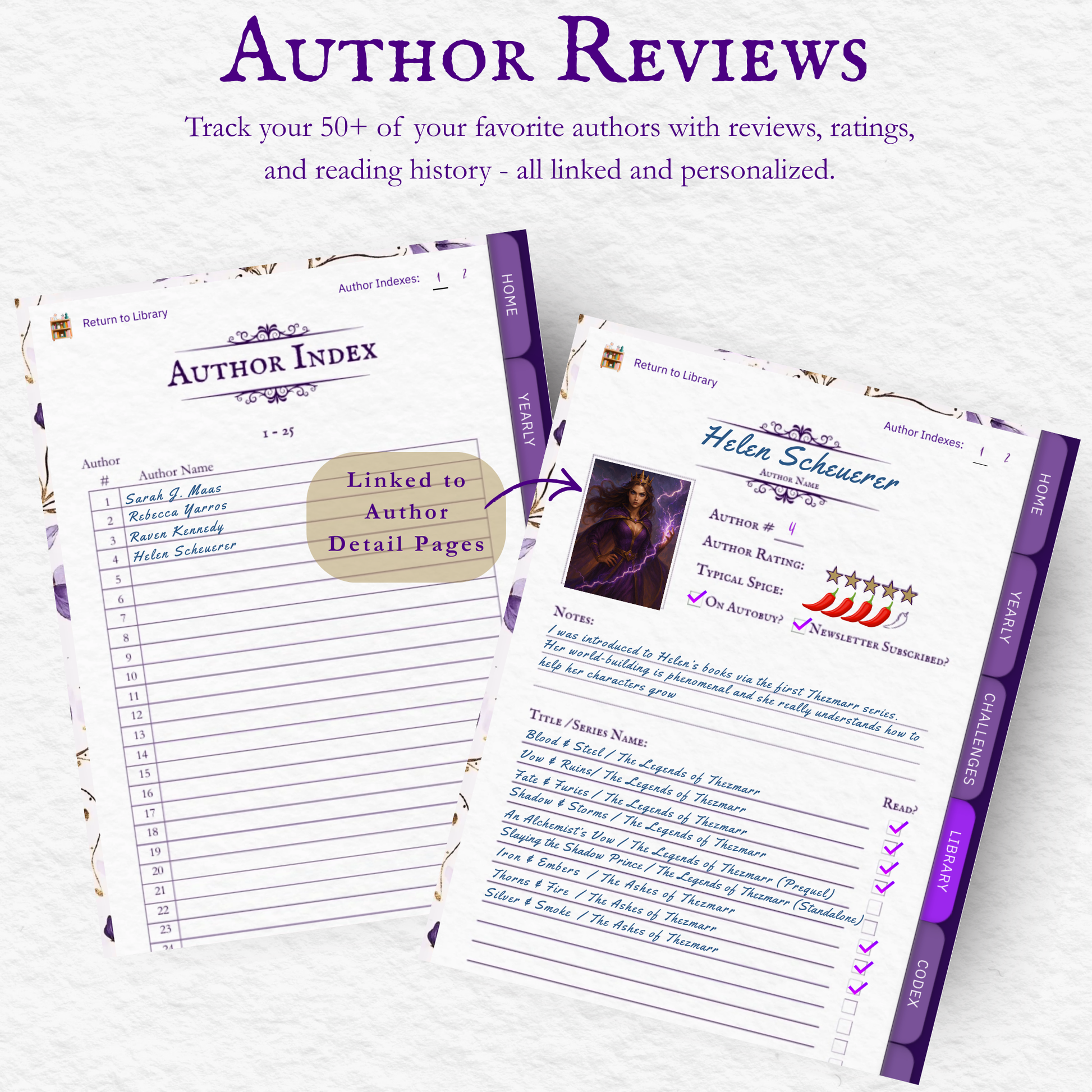 A hyperlinked, lore‑rich reading journal for romantasy lovers who want deeper immersion. Stop forgetting plot twists, losing track of alliances, or scrambling to remember world‑building details. The Romantasy Codex turns your entire reading year into a magical, organized ritual.